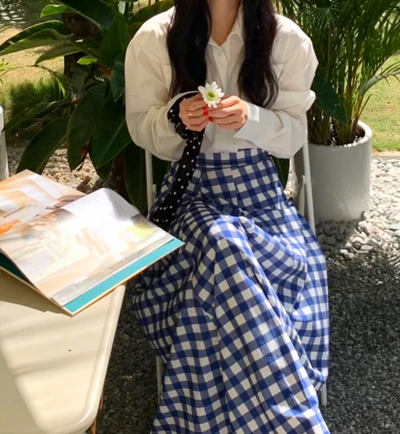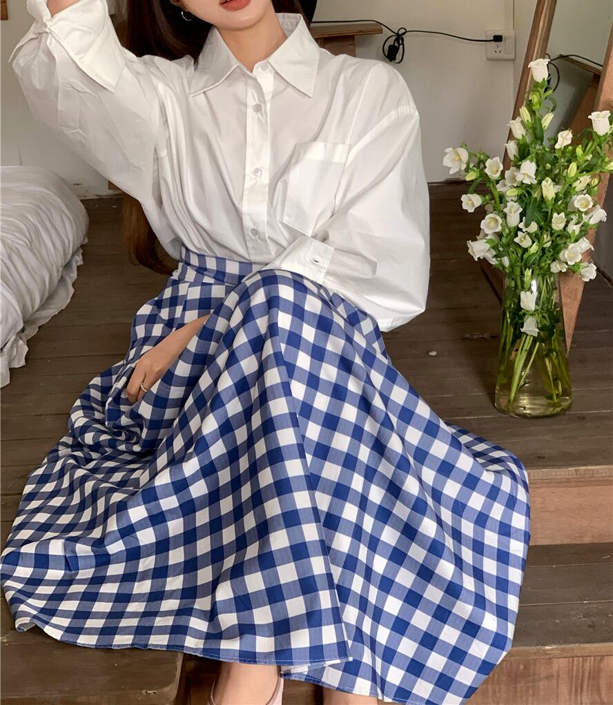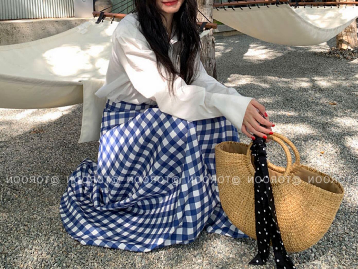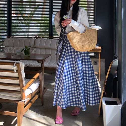 シンプルなコーディネートもブルーのギンガムチェックがオシャレをプラスしてくれます☆