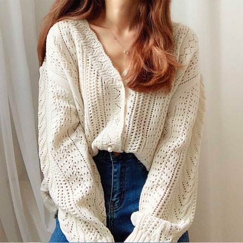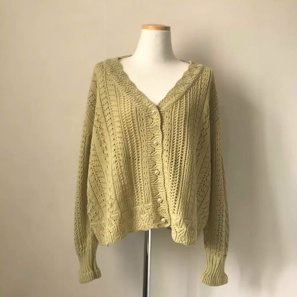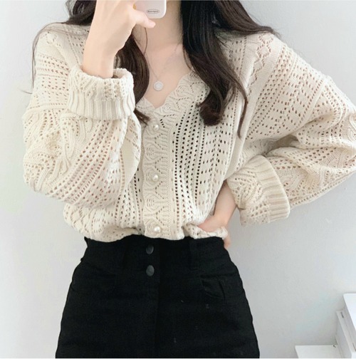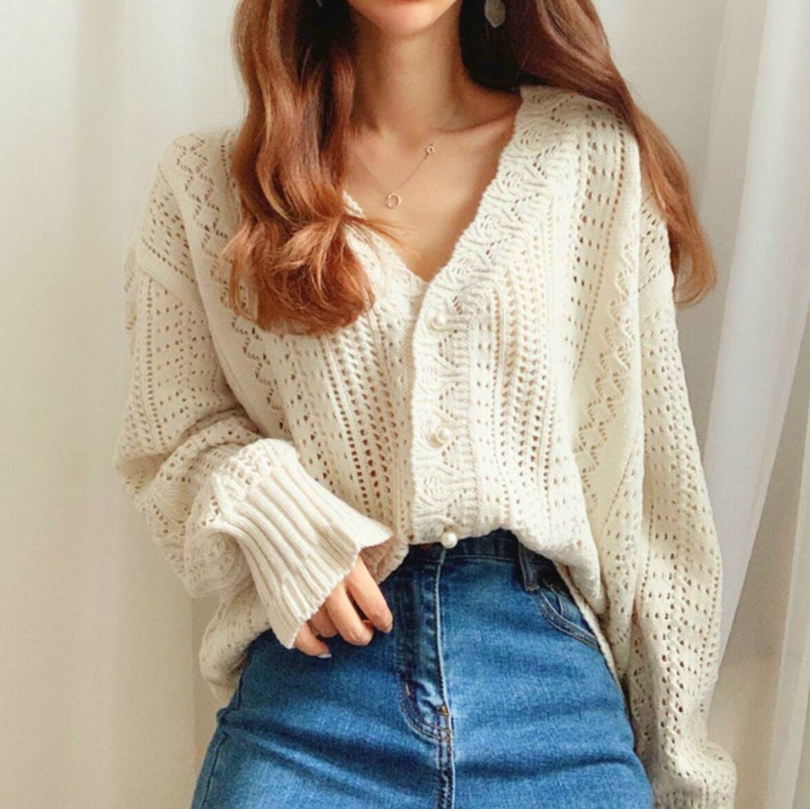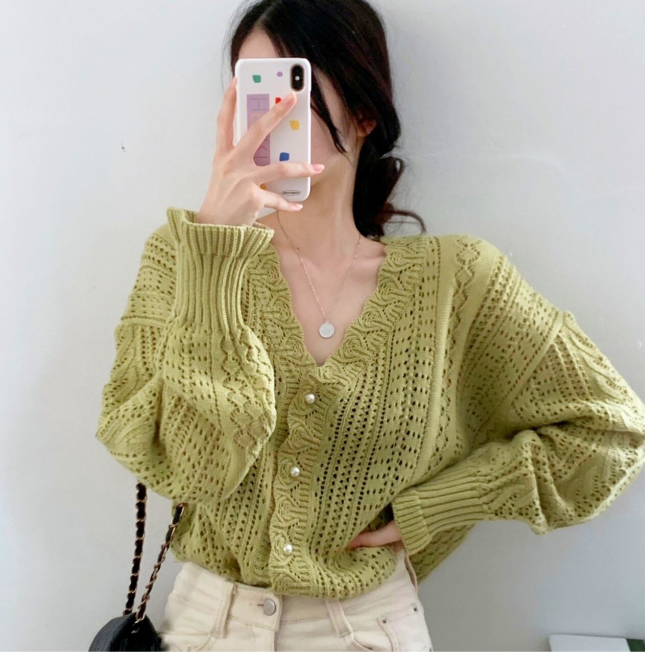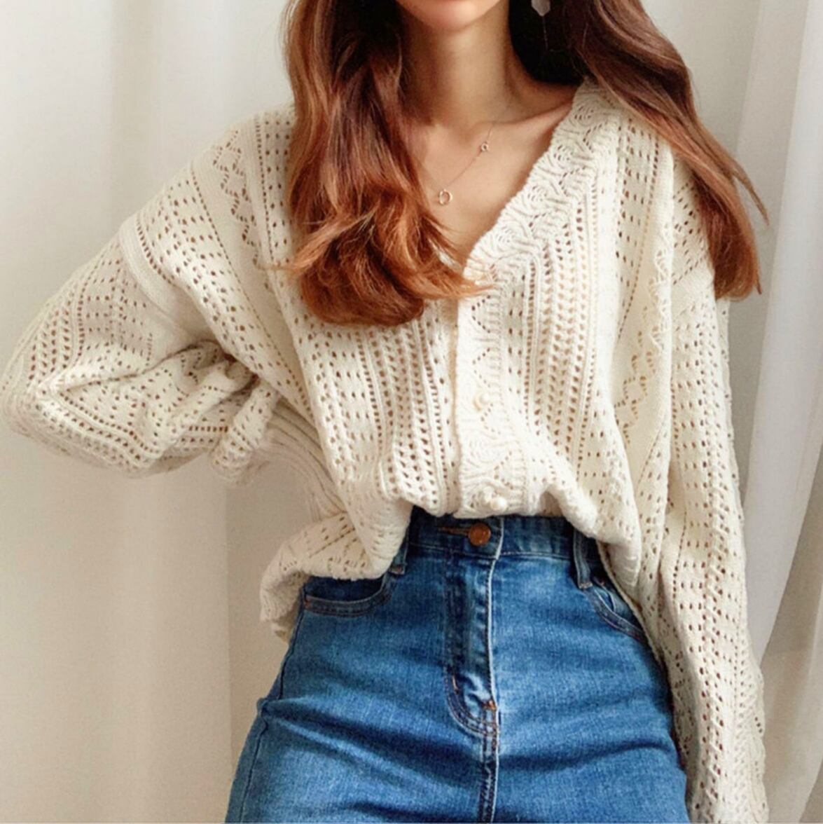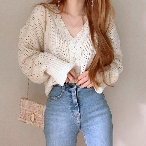 1枚で着ても羽織りとしても可愛いクロシェ編みのVネックカーディガン♪