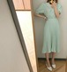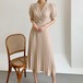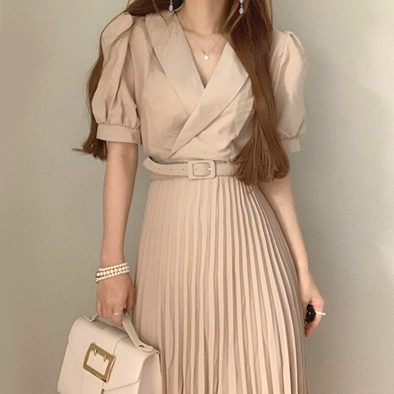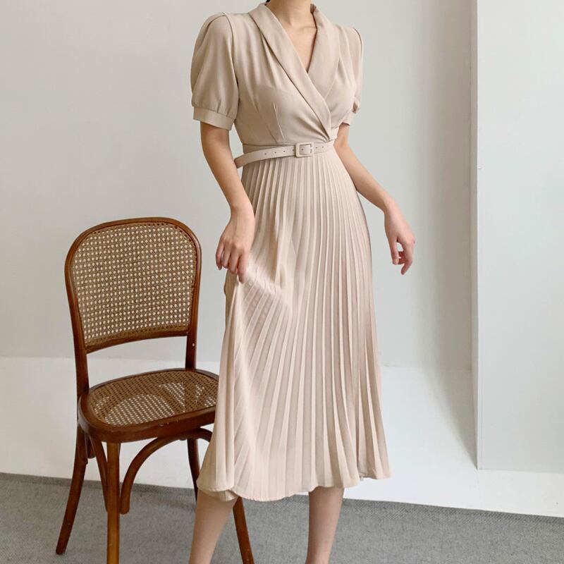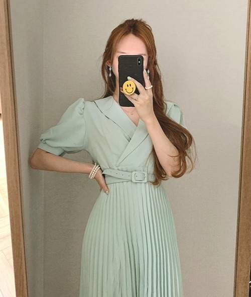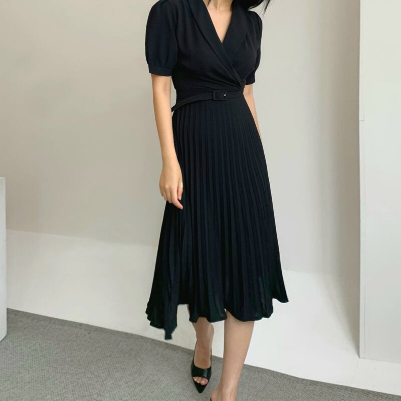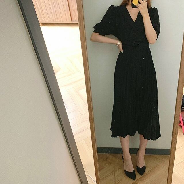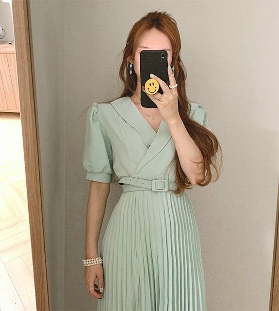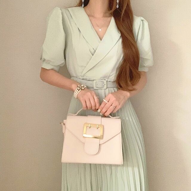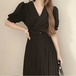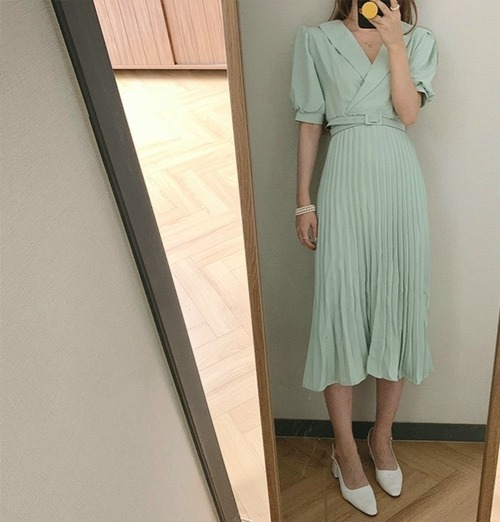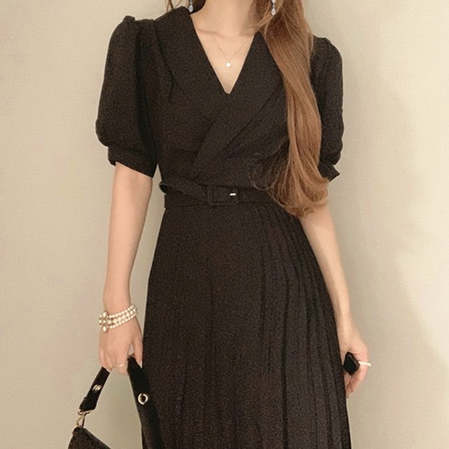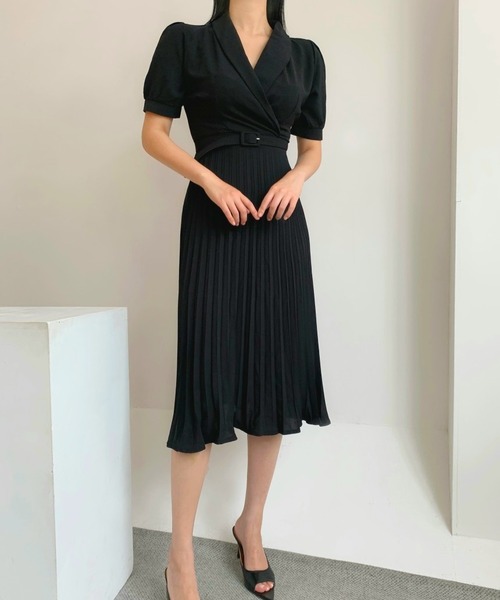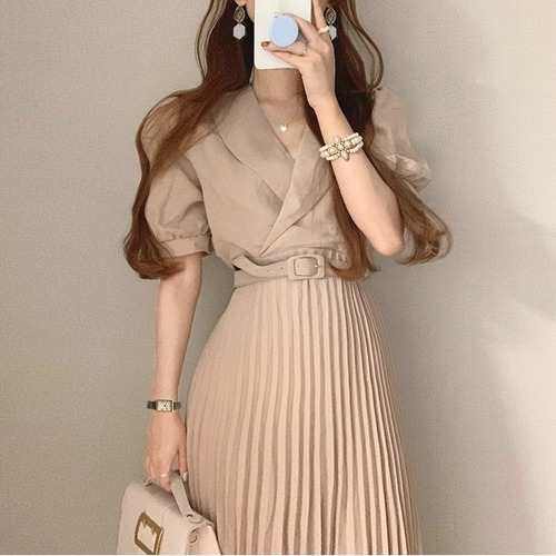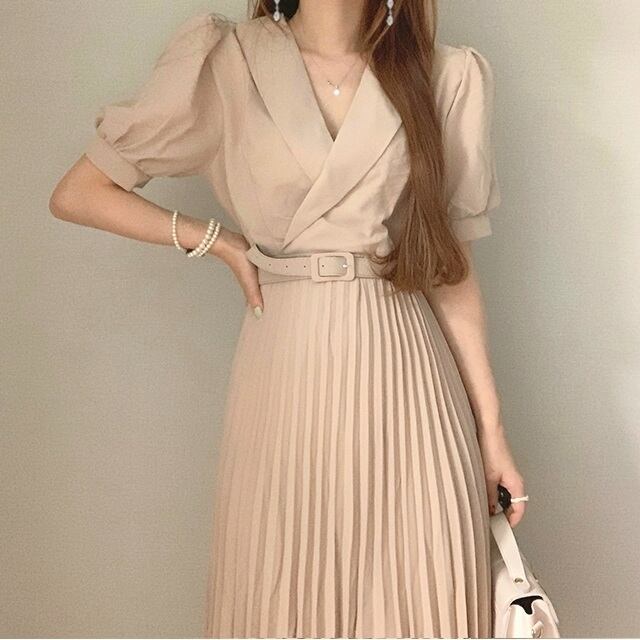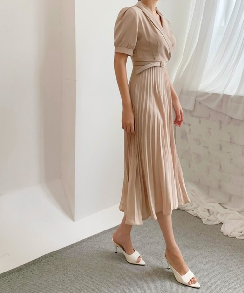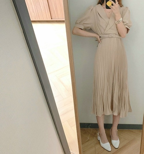 プリーツ ロング丈 ワンピース ウエストベルト 半袖 3color