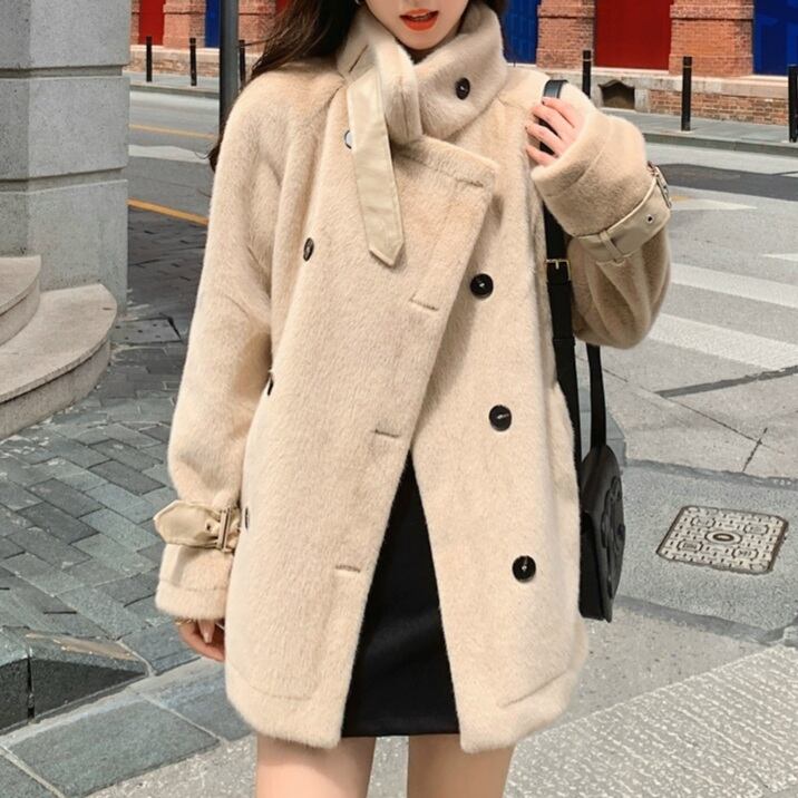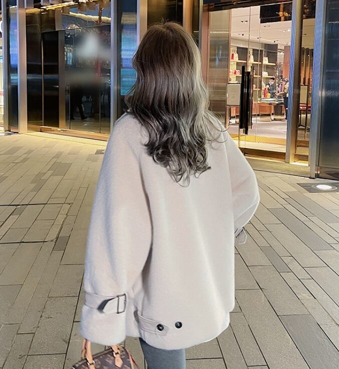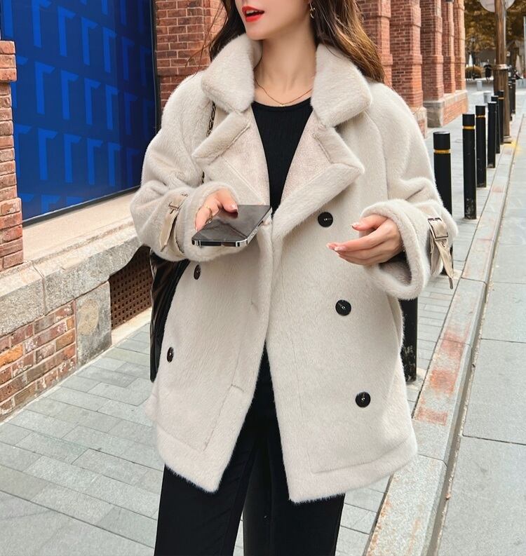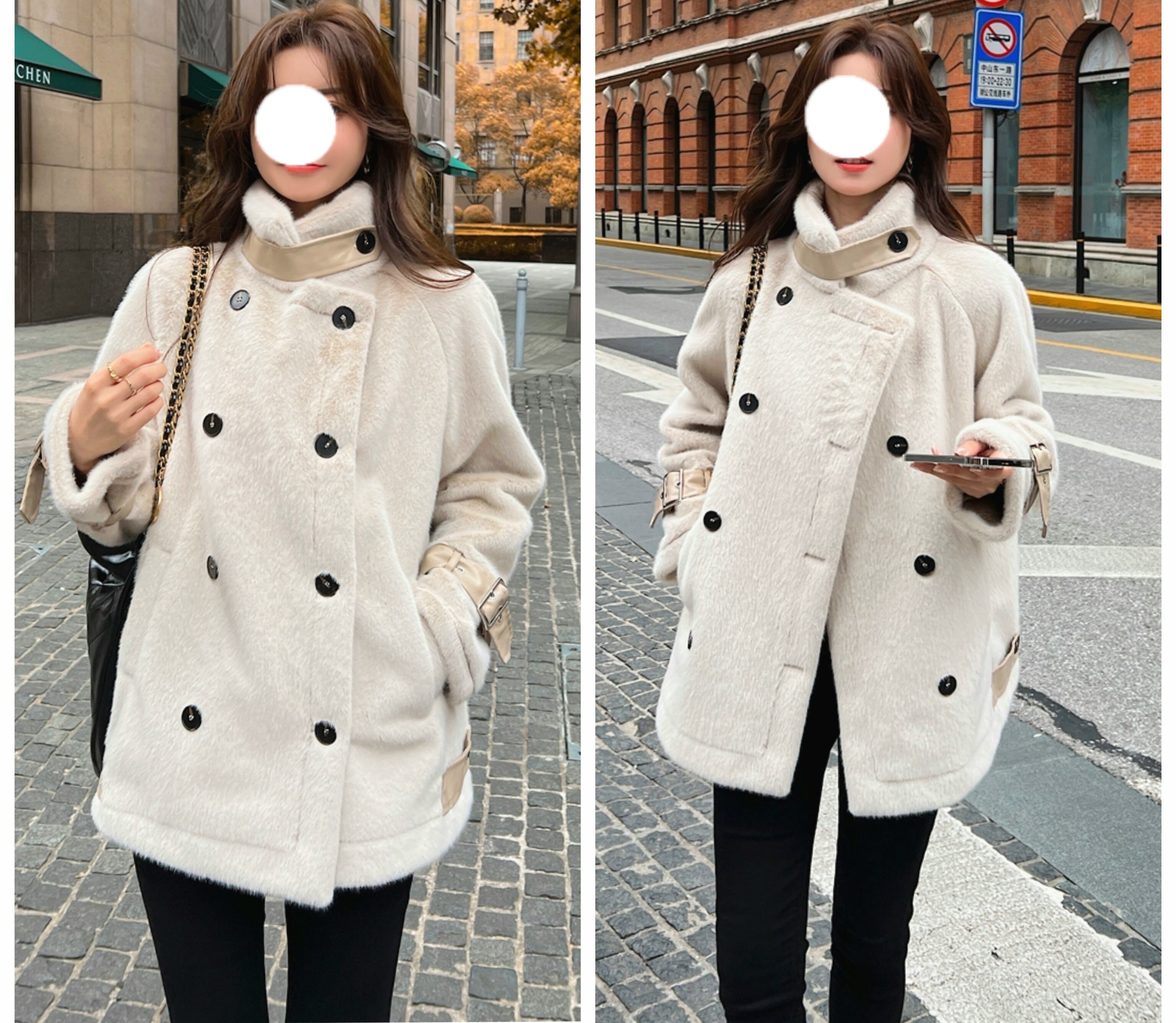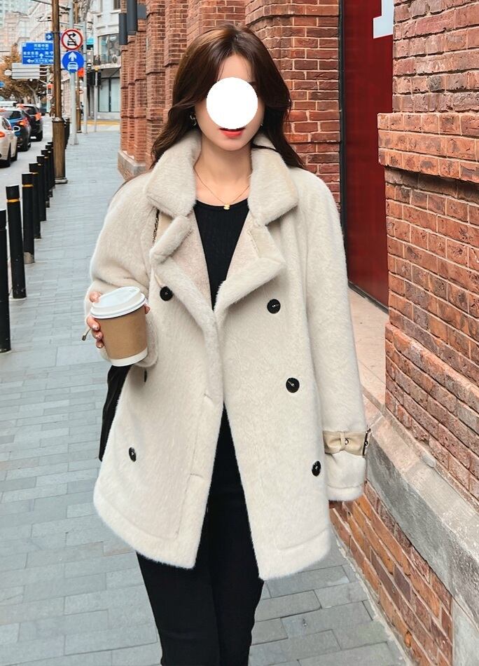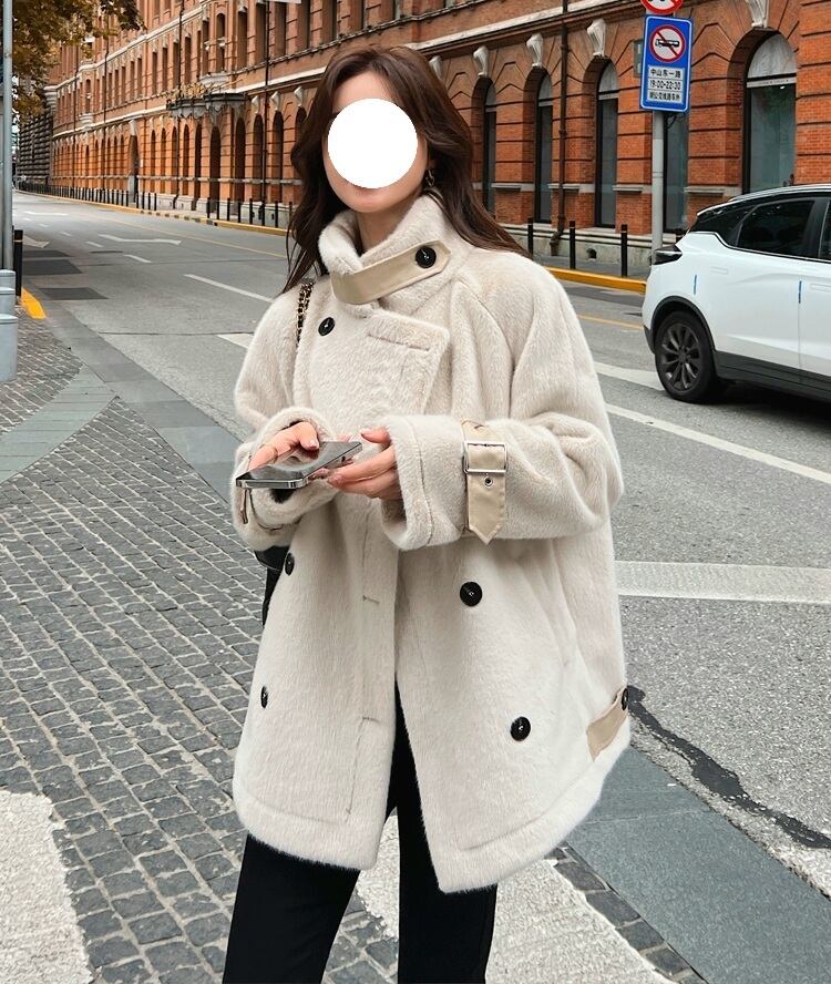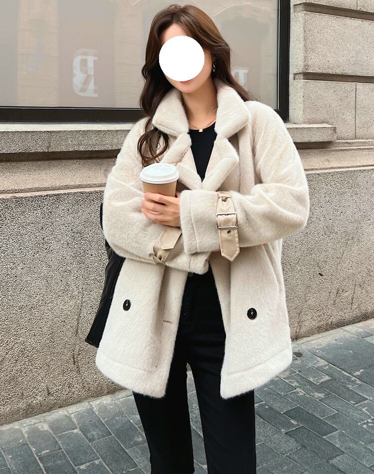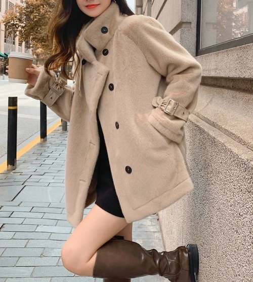 ブラックのダブルボタンと袖口のエコレザーベルトもさりげなくアクセントに♪