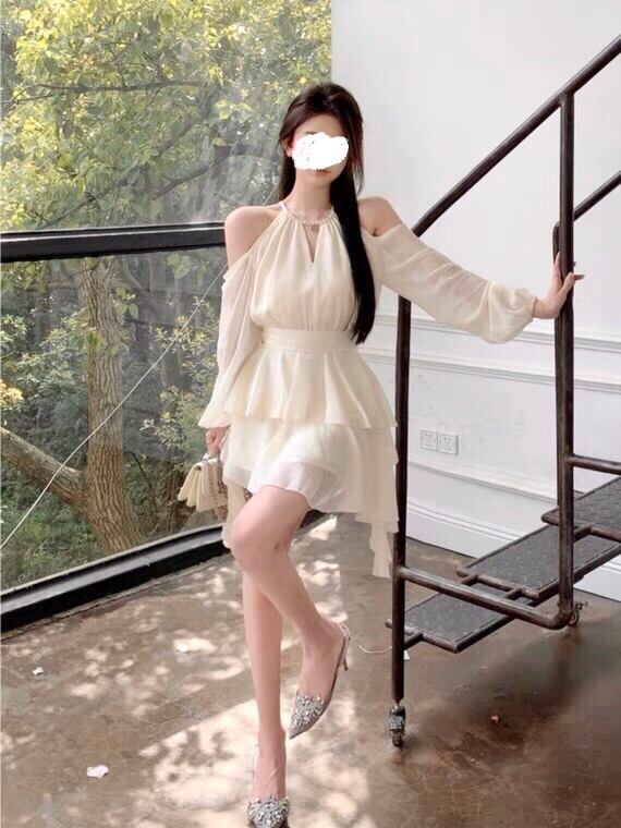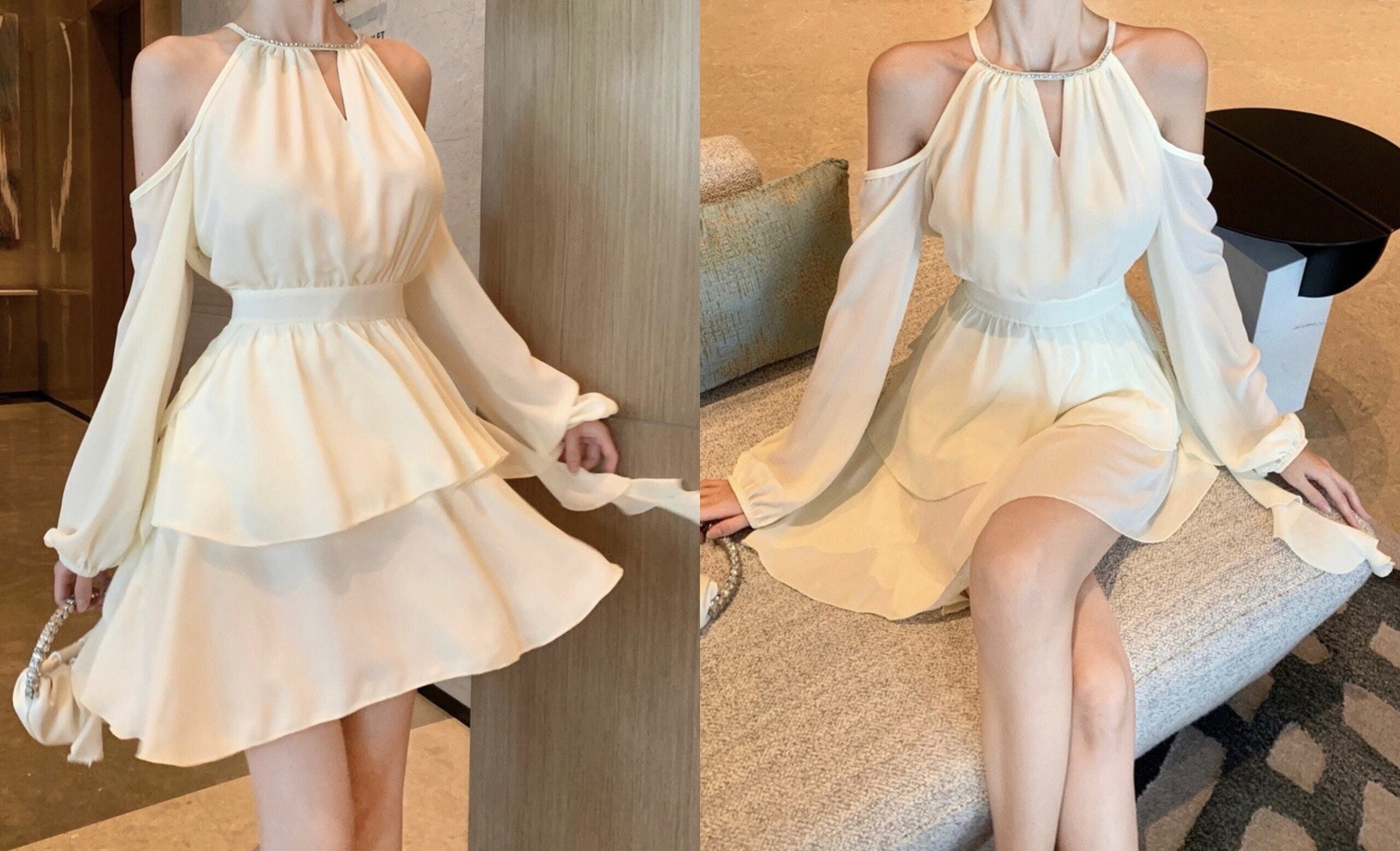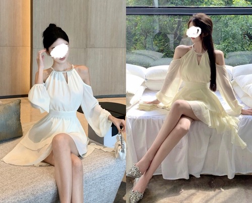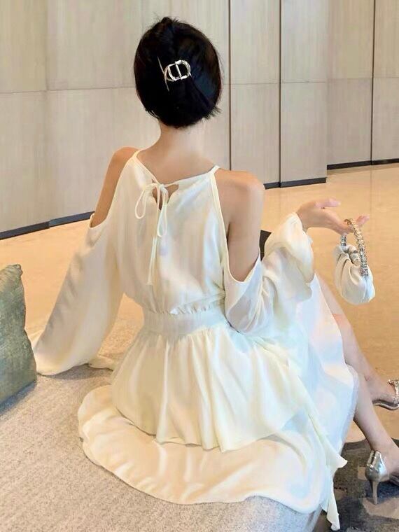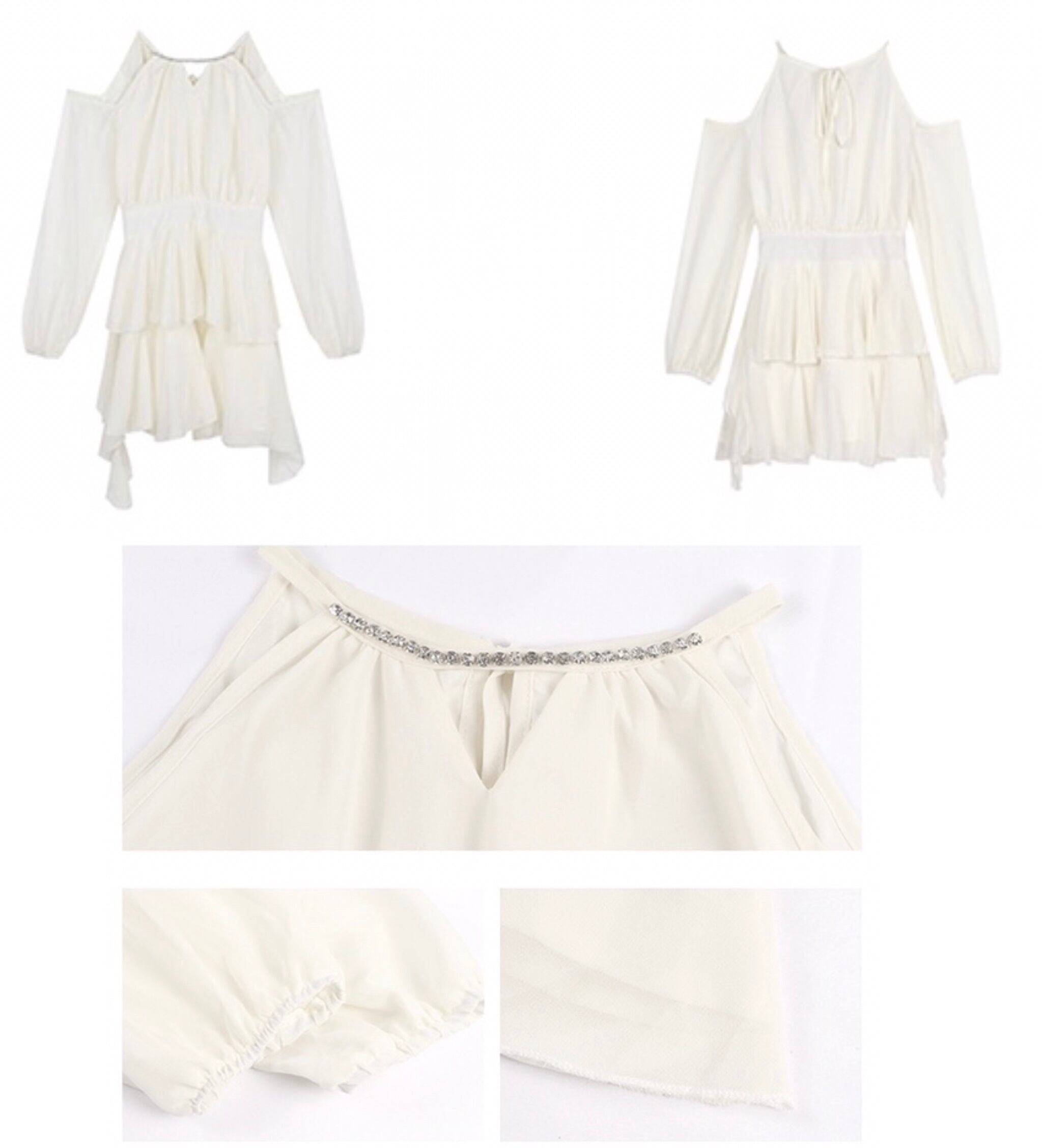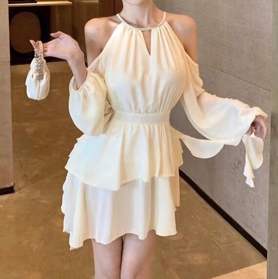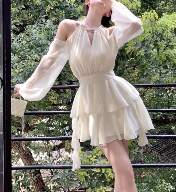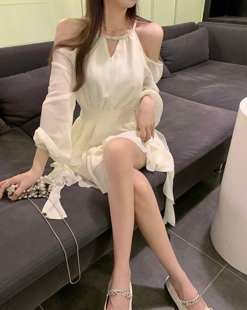 シフォン ミニワンピース オープンショルダー 長袖