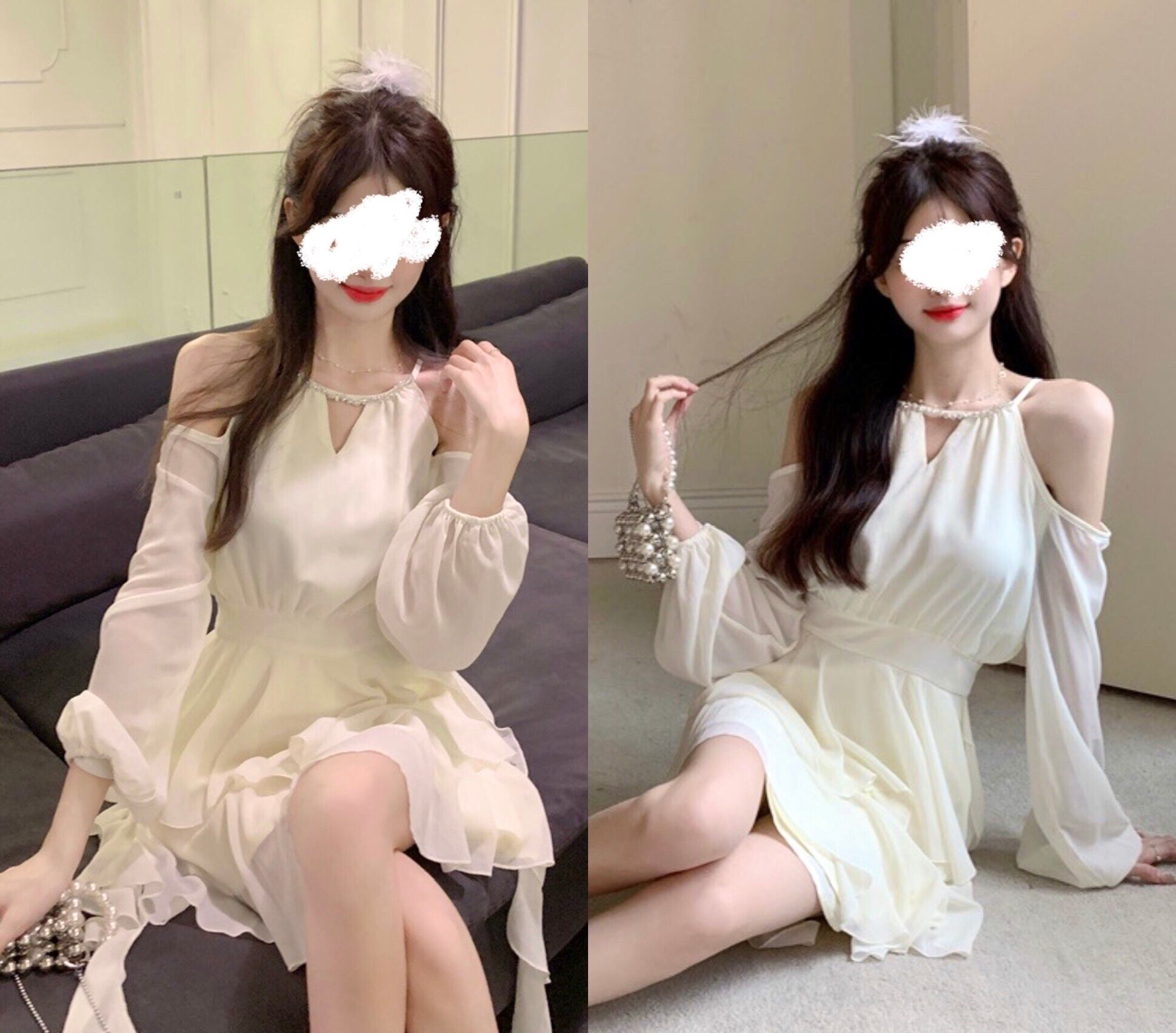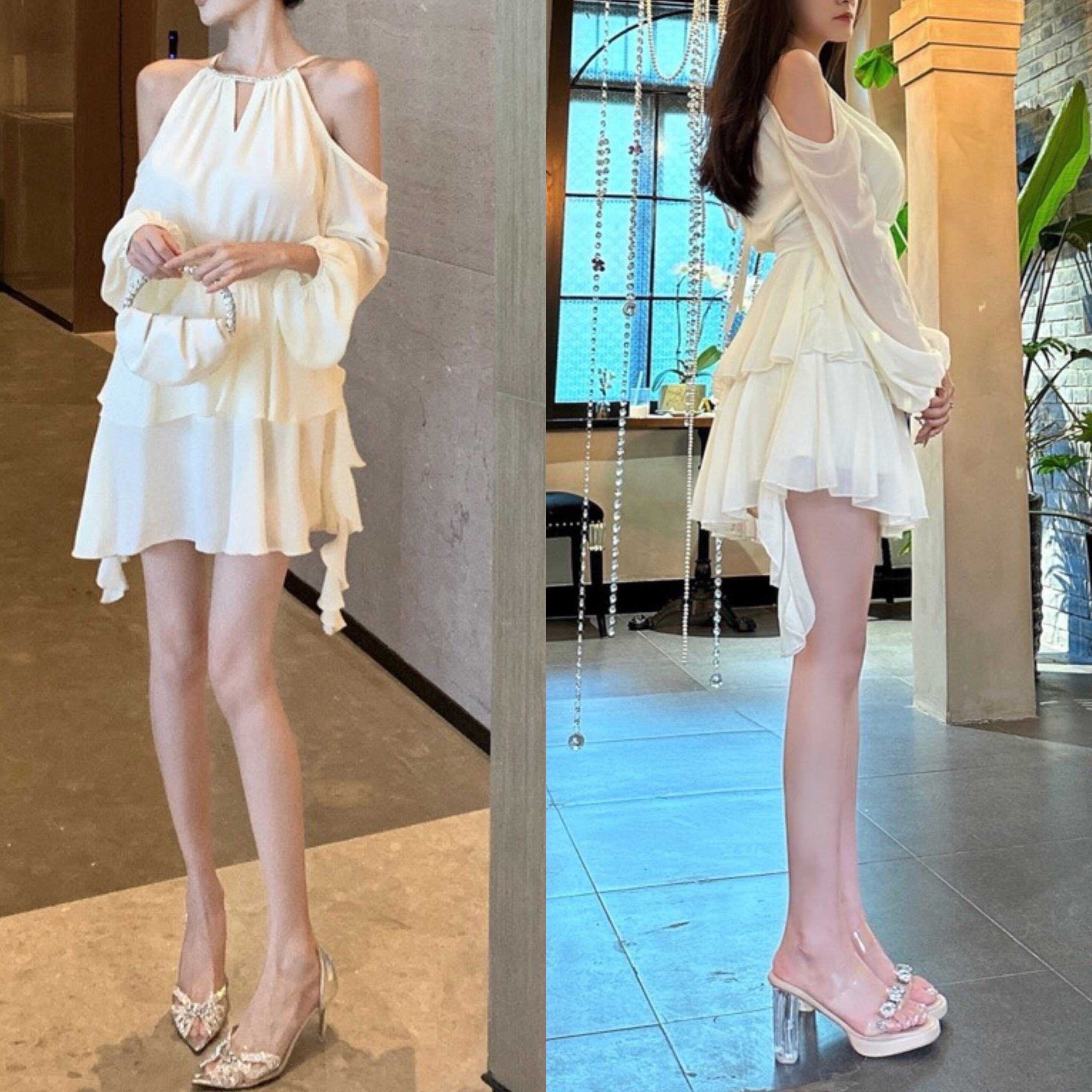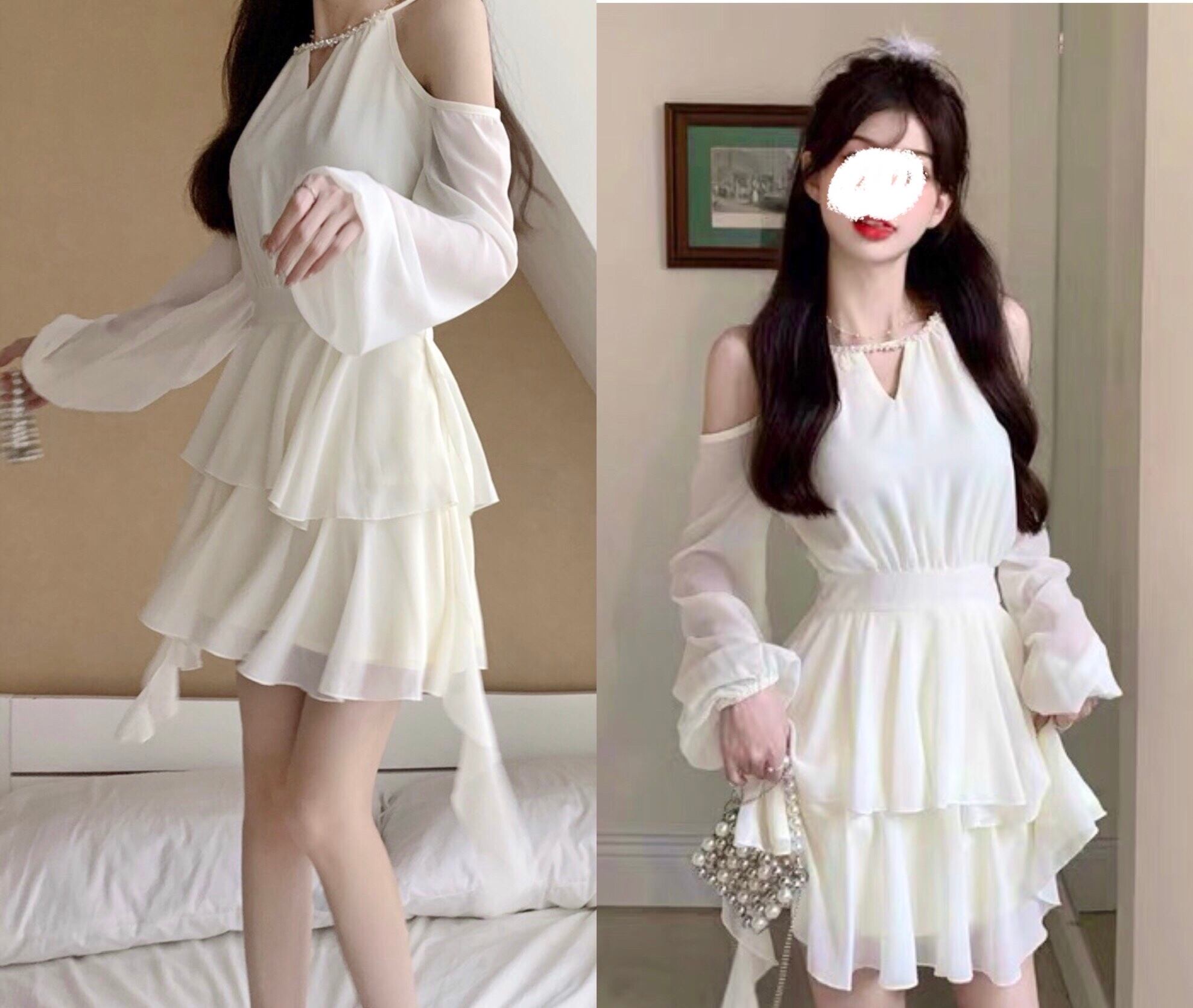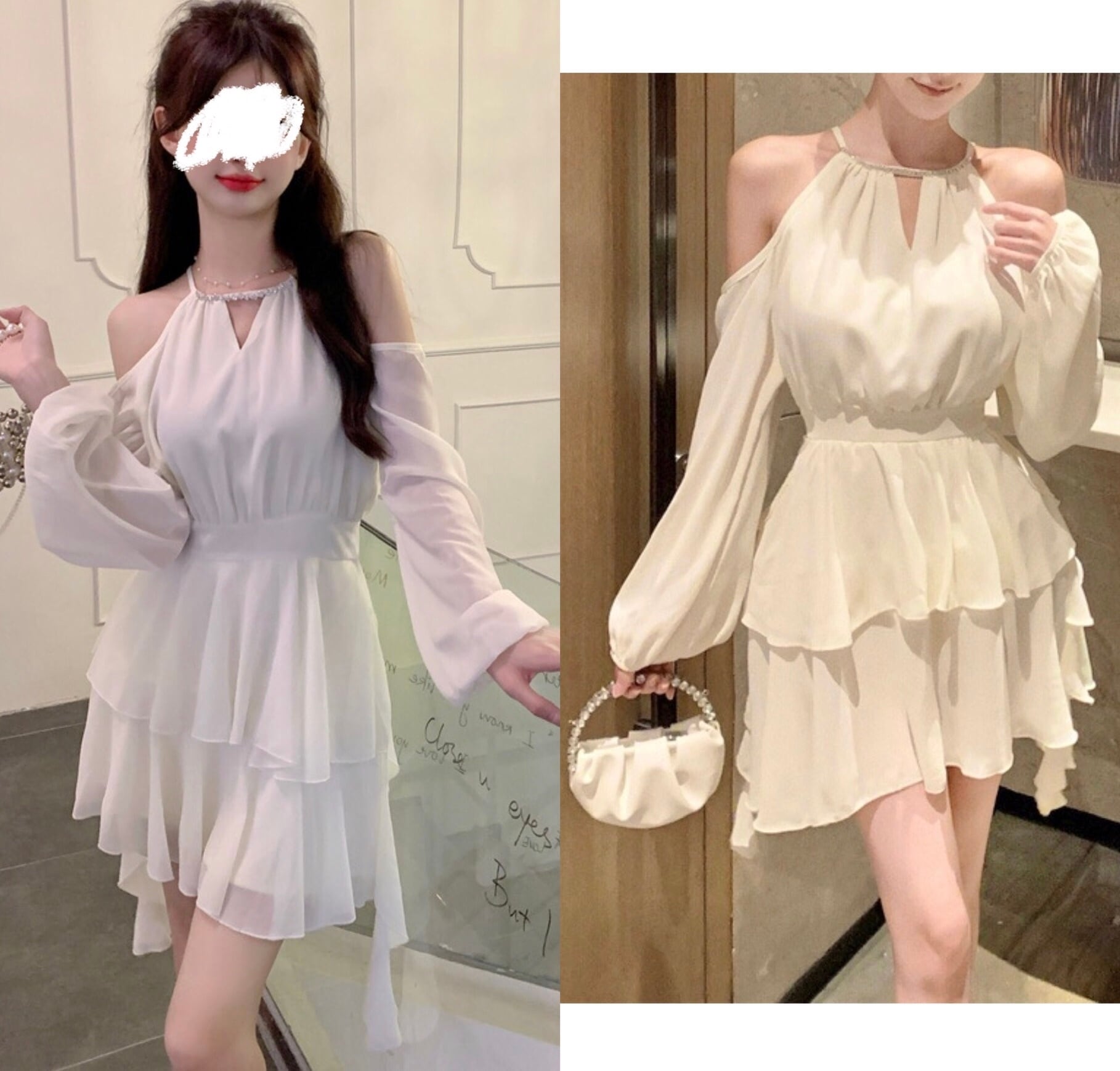 シフォン ミニワンピース オープンショルダー 長袖