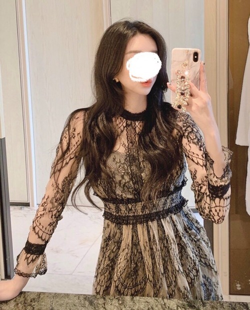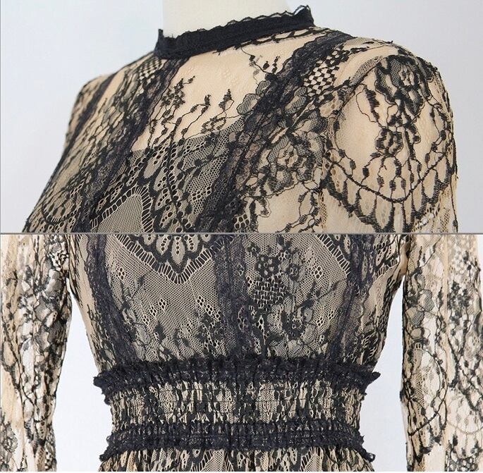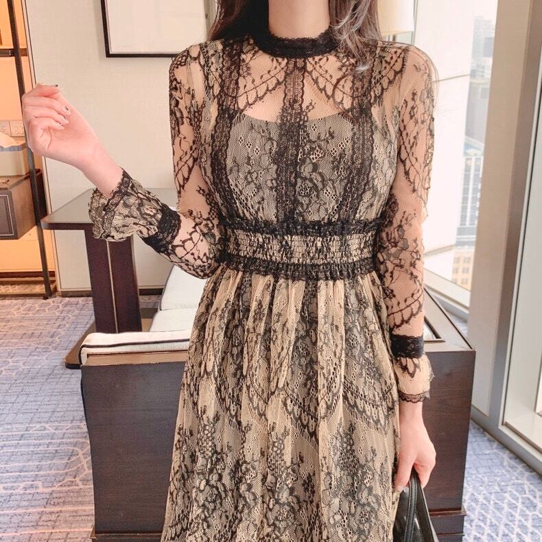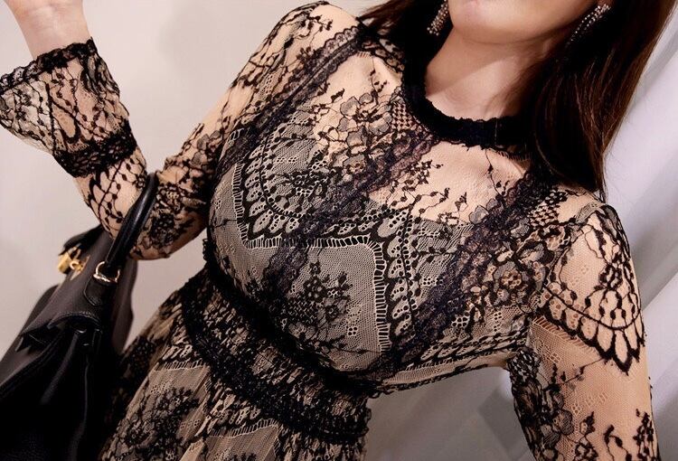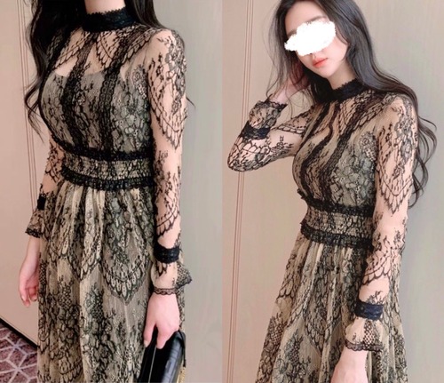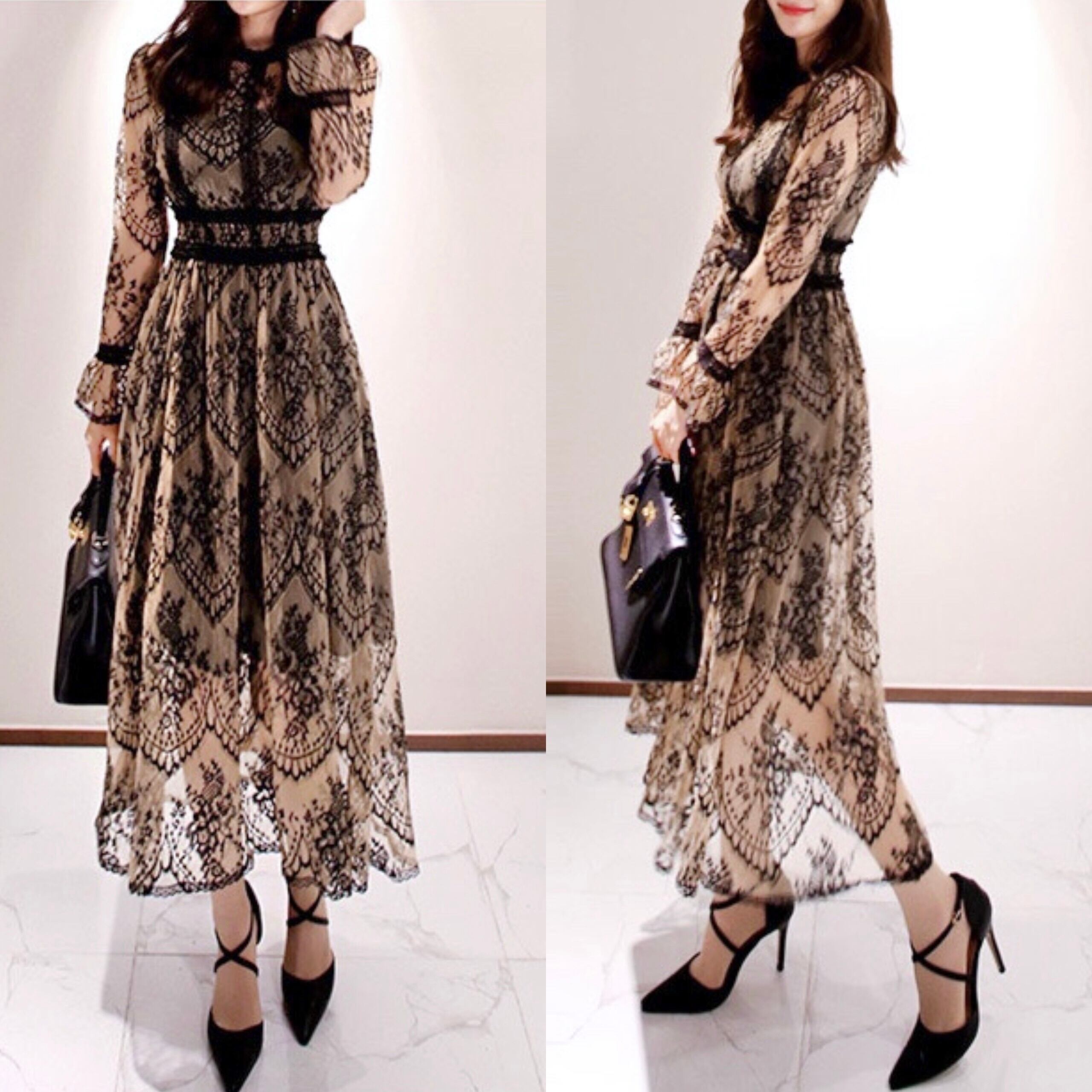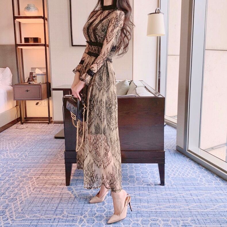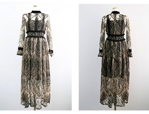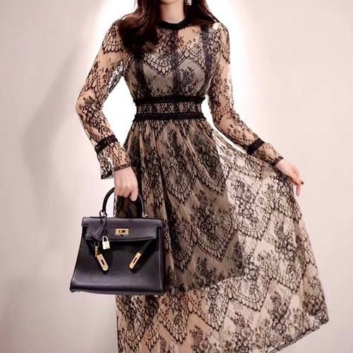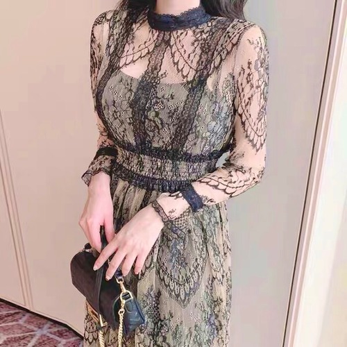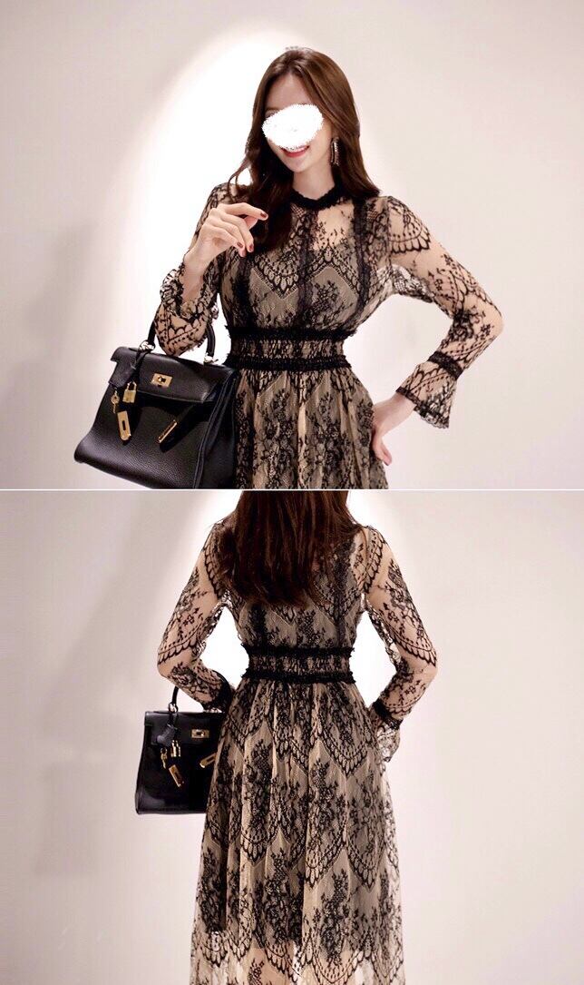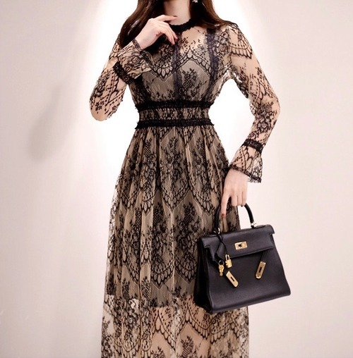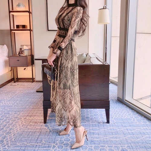 総レース ロングワンピース 長袖 透けレース